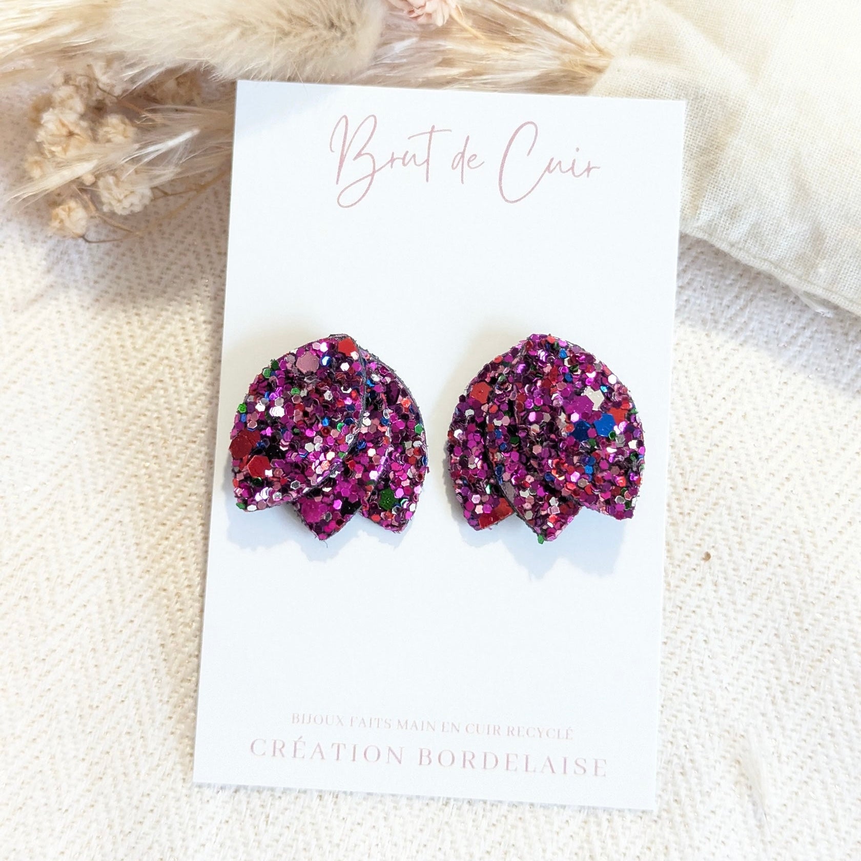 Cette paire de boucles d’oreilles est composée de trois pétales qui brillent de mille feux pour faire scintiller vos tenues. Le découpage et l'assemblage sont réalisés à la main par la créatrice.