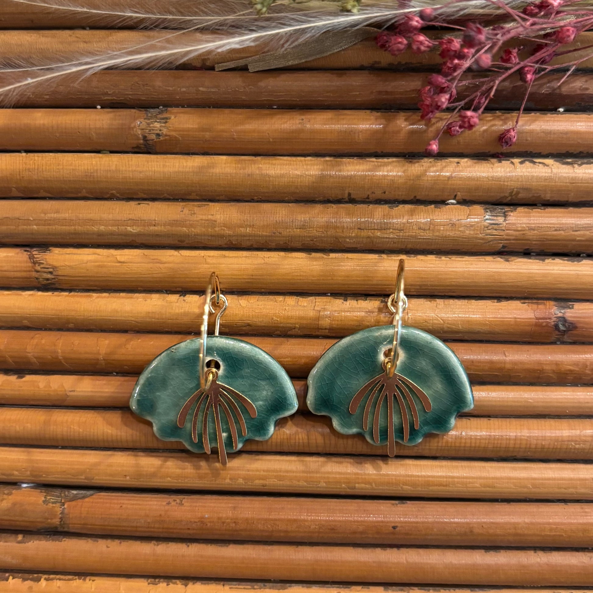 - Composition : céramique et émail sans plomb, support de boucles en laiton doré à l’or fin et apprêts en laiton