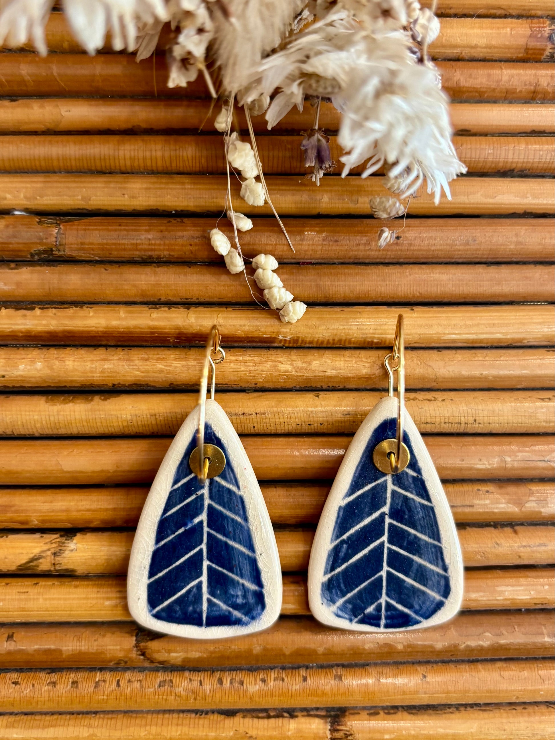 Boucles d'oreilles en céramique grande feuille bleu