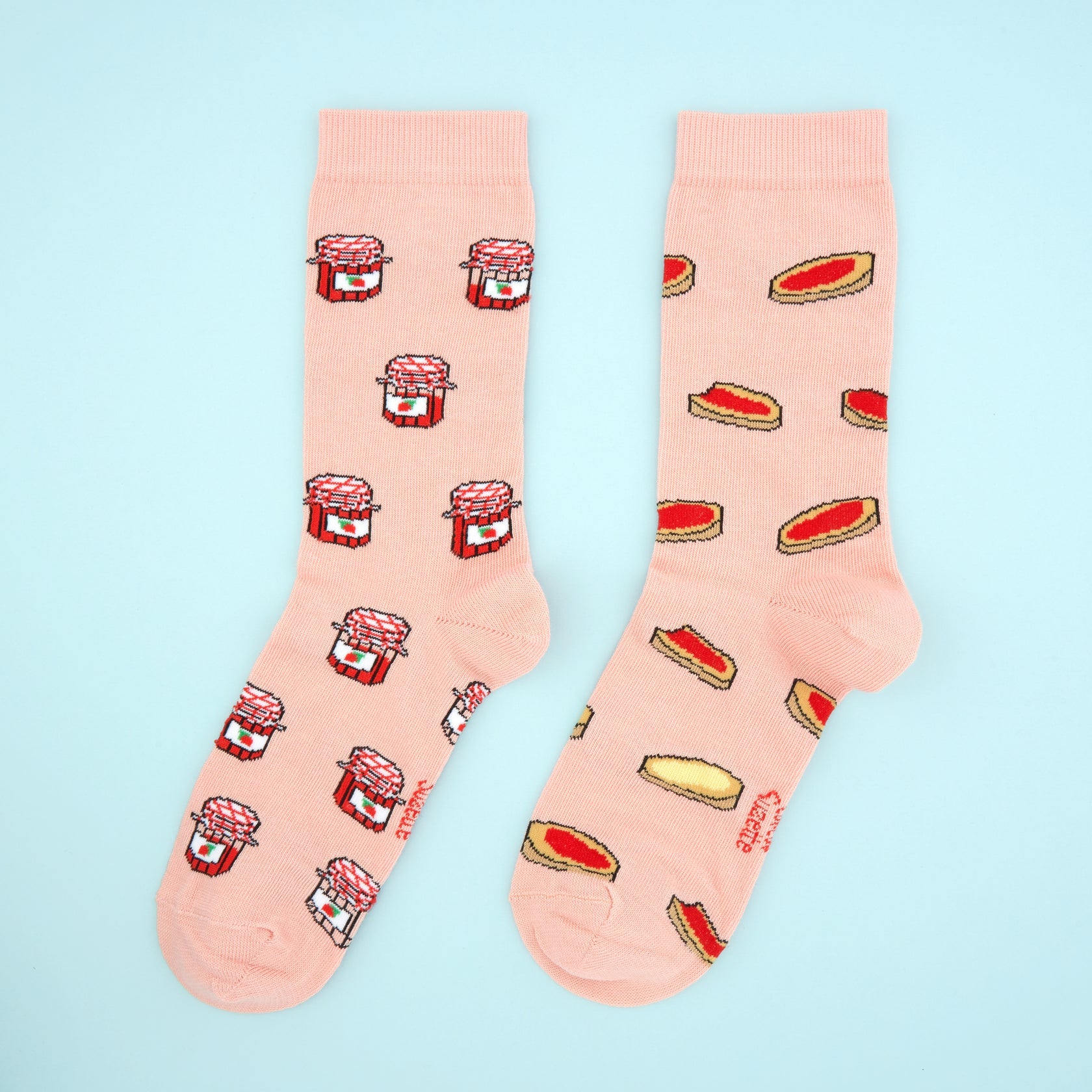Retrouvez l'univers coloré de l'illustratrice Coucou Suzette avec cette paire de chaussettes dépareillées ! L’une couverte de petits pots de confiture de fraise, l’autre, remplie de tartines généreuses.