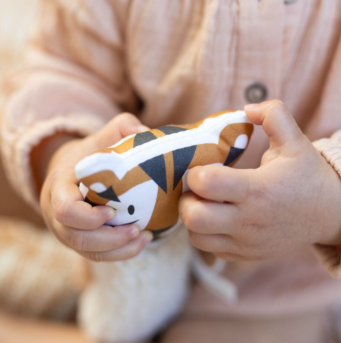 - Composition: Satin 100% coton au motif exclusif et garantie GOTS, Maille teddy Oekotex 100, Rembourrage fibre anti-acarien recyclé, Bruitage certifié CE.