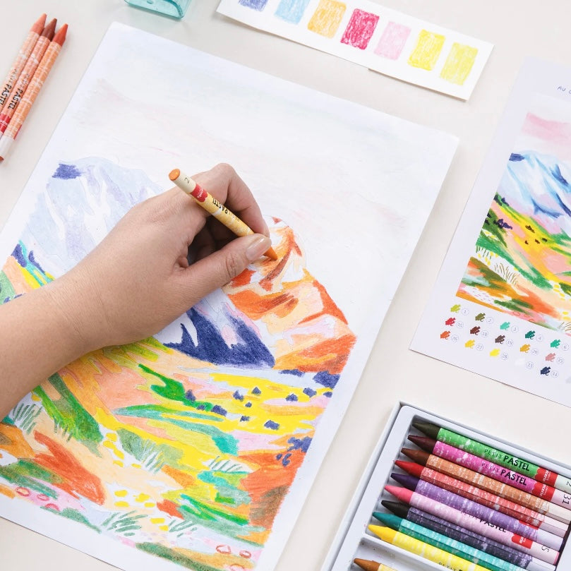 - Matériel fourni : 1 boîte de 36 pastels, 1 taille crayons, 1 illustration numérotée, 1 notice, 1 feuille d’entraînement et un tutoriel vidéo accessible par QR code pour voir les gestes